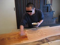 奈良漆器の塗師 Tるいさんにケヤキの木目だすために透け漆を塗っていただいてます