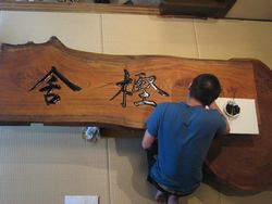 屋号に黒の漆を・・・・とても緊張感のある作業です